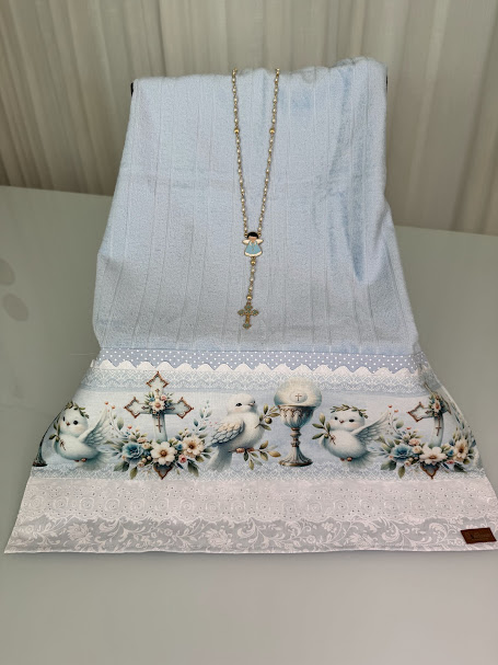 Acompanha terço infantil banhado em ouro, que enriquece a peça com um toque devocional e precioso, transformando o conjunto em um presente marcante e cheio de espiritualidade.