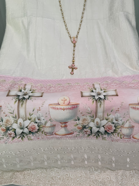 A aplicação de tricoline com padronagens religiosas adiciona significado e beleza, tornando a peça especial para momentos de fé ou para presentear com carinho.