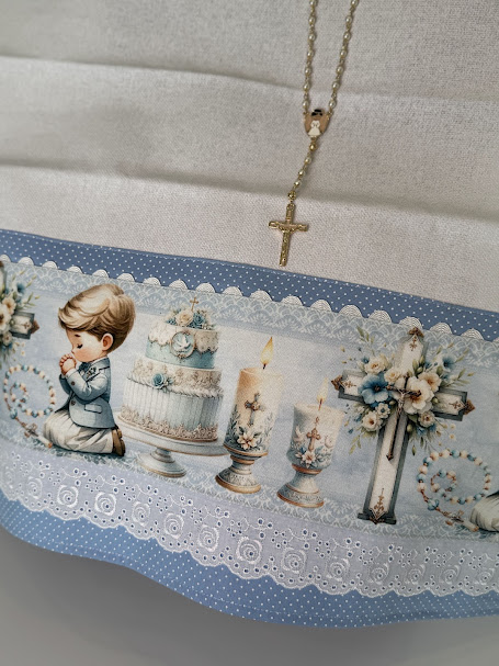 A aplicação de tricoline com padronagens eucarísticas — símbolos que remetem ao pão, ao vinho e ao sagrado mistério — torna a peça ainda mais significativa para as celebrações.