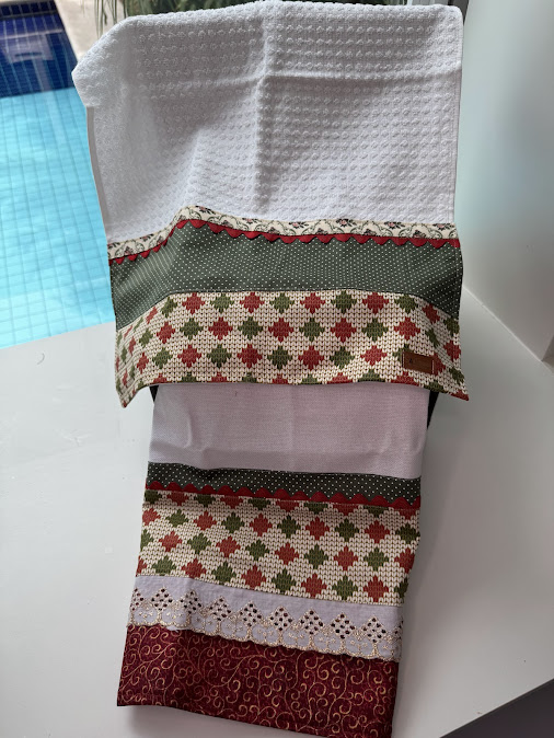 Pano de prato em tecido engomado 100% algodão, e toalha para mão com padronagem em tricoline de Natal, trazendo delicadeza e devoção ao ambiente.