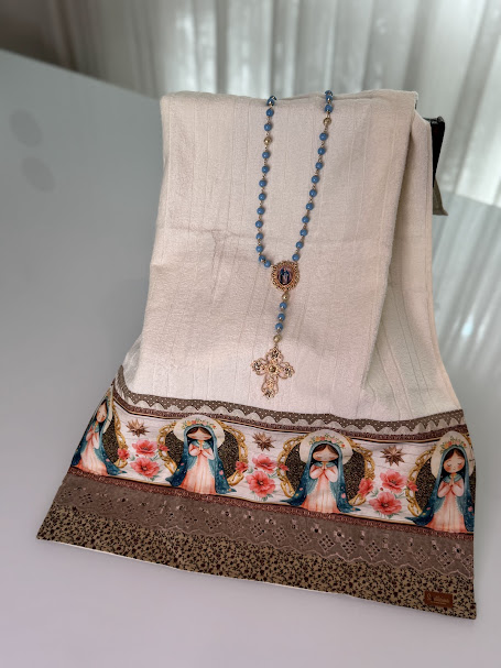 A aplicação de tricoline com padronagens religiosas adiciona significado e beleza, tornando a peça especial para momentos de fé ou para presentear com carinho.