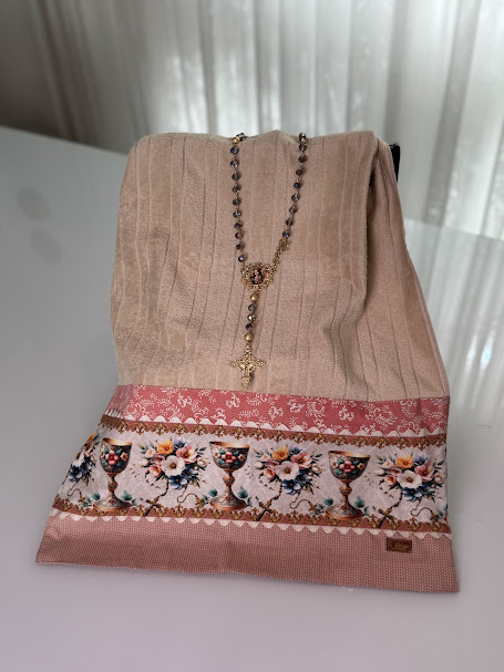 A aplicação de tricoline com padronagens religiosas adiciona significado e beleza, tornando a peça especial para momentos de fé ou para presentear com carinho.
