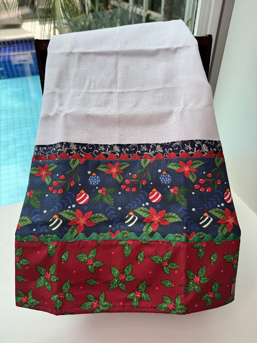A aplicação de tricoline com padronagens natalinas adiciona significado e beleza, tornando a peça especial para presentear com carinho.