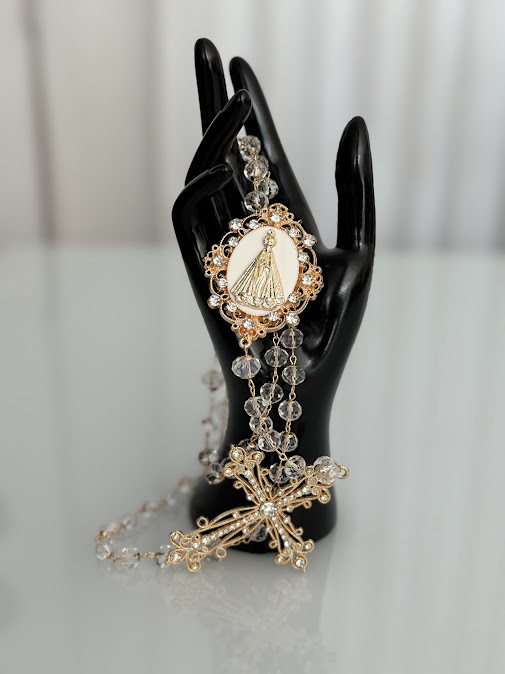 - Terço banhado em ouro, feito em cristal de vidro translúcido com tulipas, e intermediario de Nossa Senhora Aparecida banhado em ouro com cristais.